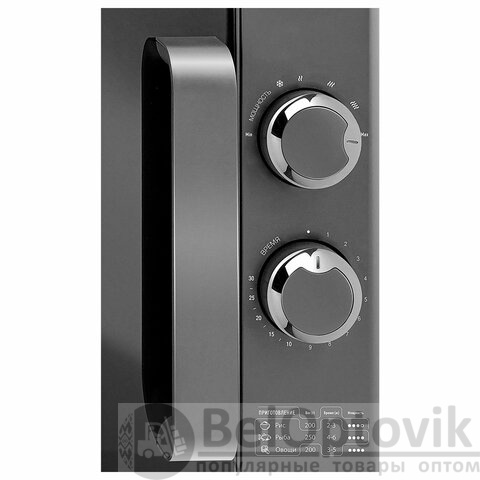 Прибор подходит для приготовления, разогрева и размораживания, поддерживает 6 режимов мощности. Чтобы начать работу, просто поверните ручку управления, установив нужное время и мощность.