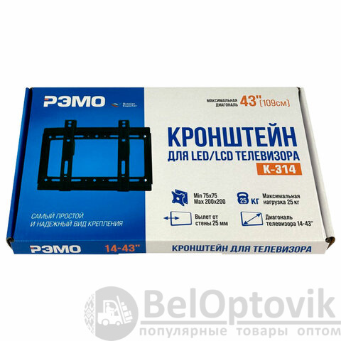 Кронштейн-крепление для ТВ К-314, до 25 кг, VESA 75х75-200х200, 14"-43", РЭМО 4603225028826, 960139