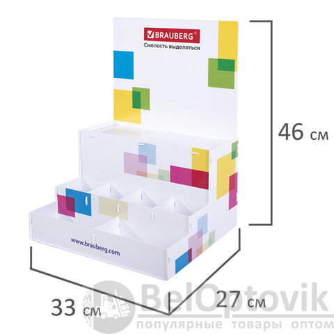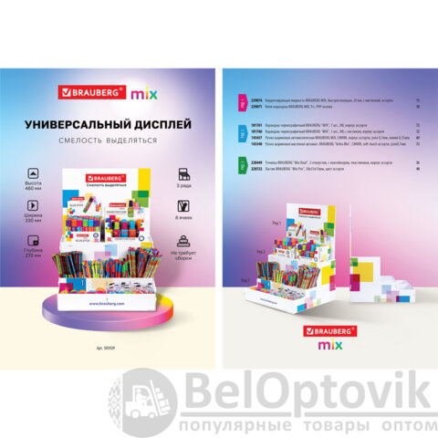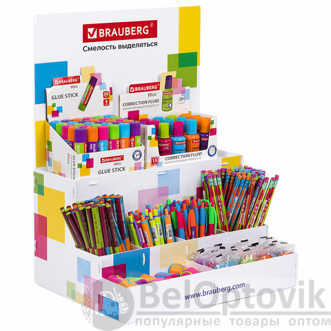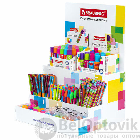 Универсальные дисплеи BRAUBERG позволяют разместить максимальное количество продаваемого ассортимента серии MIX даже в небольших торговых пространствах. Яркий дизайн дисплея привлечет внимание покупателей к товару.