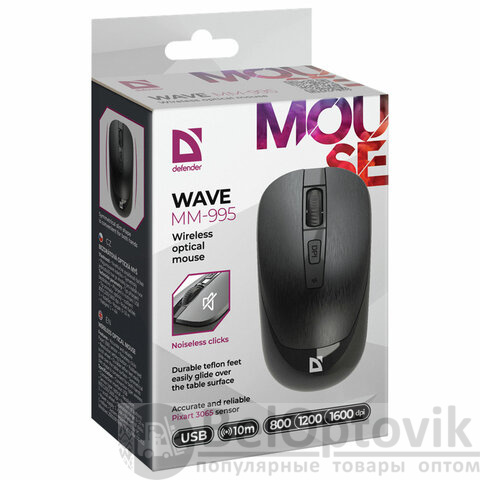 Мышь беспроводная бесшумная DEFENDER Wave MM-995, USB, 3 кнопки + 1 колесо-кнопка, оптическая, черная, 52995