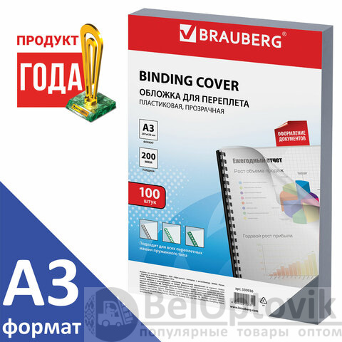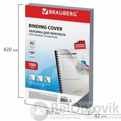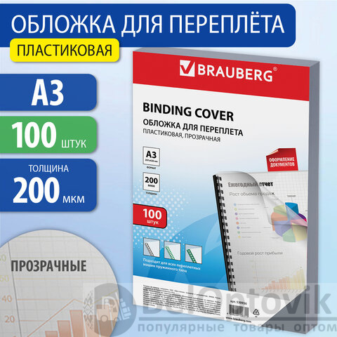 Обложки пластиковые для переплета БОЛЬШОЙ ФОРМАТ А3, КОМПЛЕКТ 100 шт., 200 мкм, прозрачные, BRAUBERG, 530936