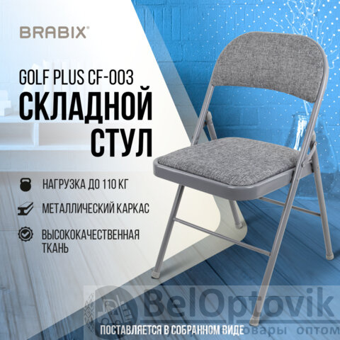 Практичная и удобная модель складного стула BRABIX "Golf Plus CF-003" прекрасно подойдет для оснащения офисных учреждений, поликлиник, мест ожидания, холлов, учебных заведений, конференц-залов, административных помещений, гостиниц, дворцов спорта.