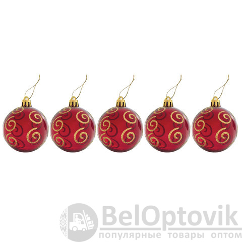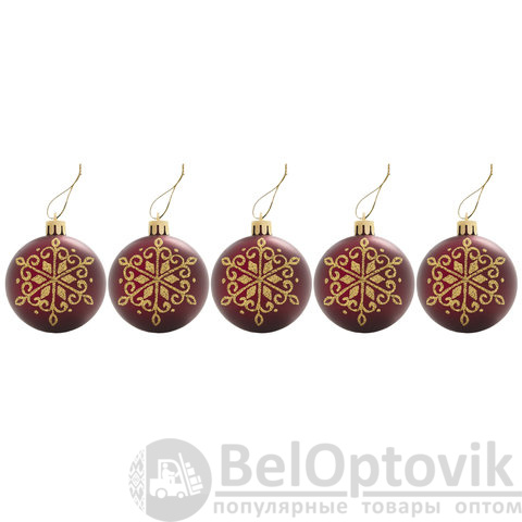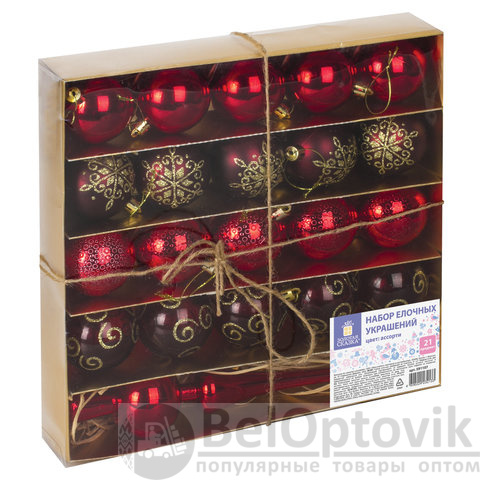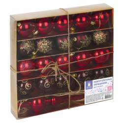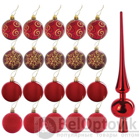 В набор входят: 5 шаров классического красного цвета с глянцевым покрытием (6 см), 5 шаров цвета "красное вино" с матовым покрытием и рисунком (6 см), 5 шаров красного цвета с текстурой (6 см), 5 прозрачных шаров винного цвета с рисунком (6 см) и наконечник на ель красного цвета с глянцевым покрытием (28 см).