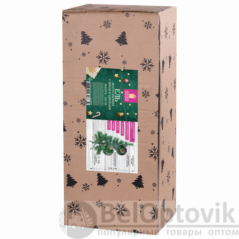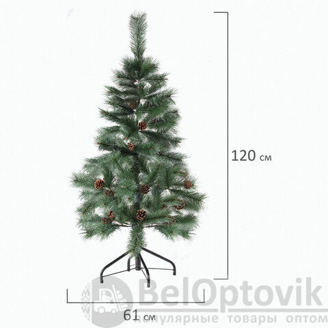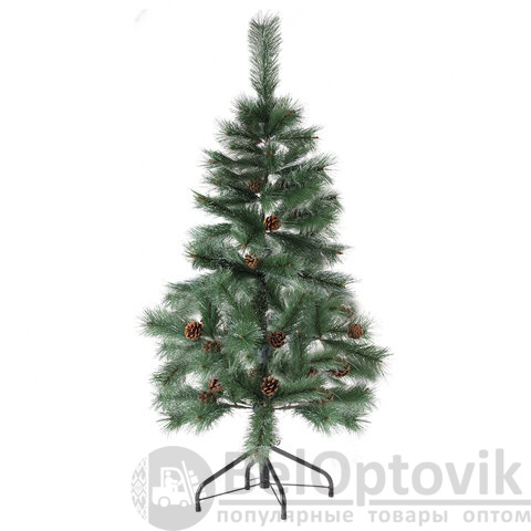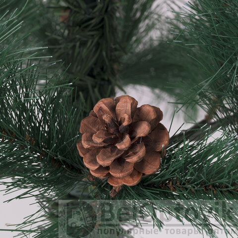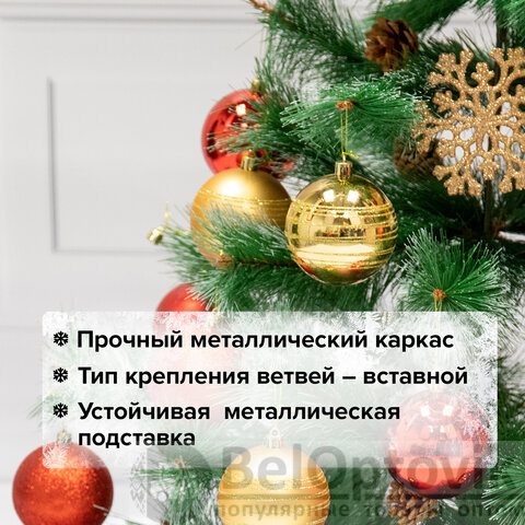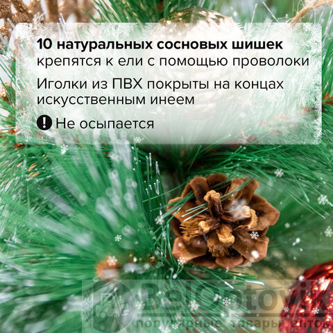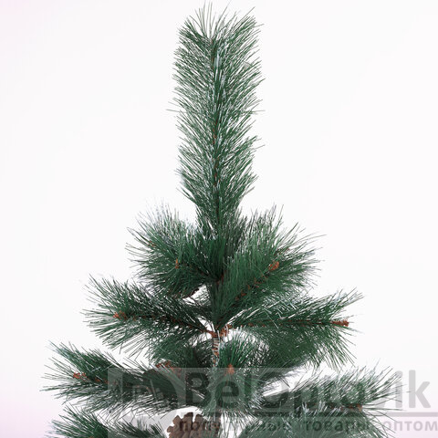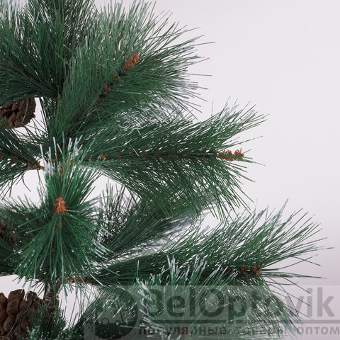 Ель искусственная напольная представляет собой конструкцию из металлического каркаса и закрепляемых на нем ветвей. Материал хвои - ПВХ. Цвет хвои - зеленый. Кончики иголок декорированы "искусственным инеем". Также к ветвям ели прикреплены с помощью проволоки 10 натуральных сосновых шишек.