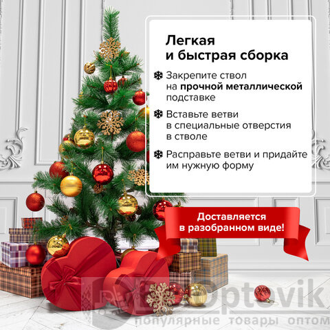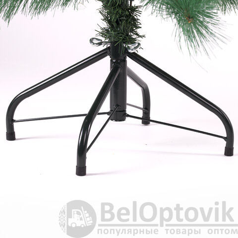 Тип крепления ветвей к стволу - вставной. Данный тип крепления подразумевает, что ветви и ствол поставляются в разобранном виде. Ель легко и быстро собирается: сначала необходимо закрепить ствол к подставке, а затем вставить ветви в специальные пазы, предусмотренные конструкцией ствольной части ели. После этого необходимо отогнуть крупные ветви от ствола и придать ели более пышную форму, расправляя мелкие ветки. Материал подставки - металл.