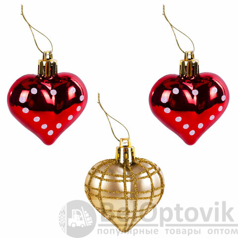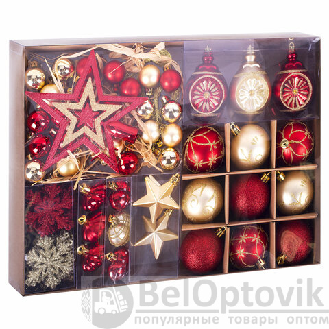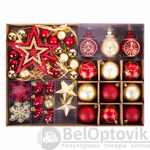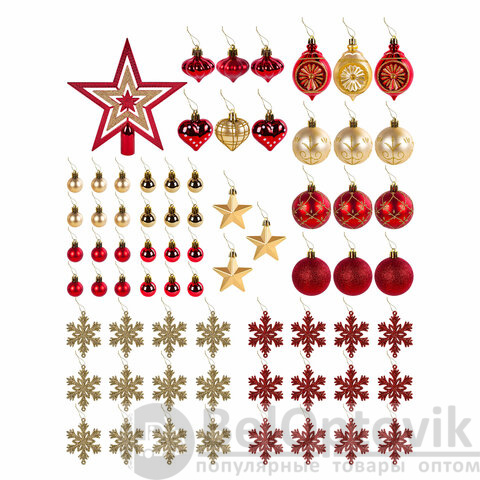 Набор украшений для ели включает в себя 70 предметов разной формы: сферической формы, в форме звезды, снежинки, сердца, пятиконечной звезды.