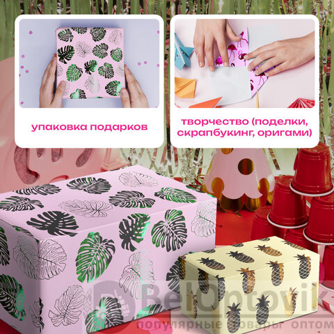 Набор упаковочной бумаги с разноцветным фольгированием "Colorful Tropics" ЗОЛОТАЯ СКАЗКА отлично подходит для упаковки подарков, а также для рукоделия, декора и других дизайнерских решений.