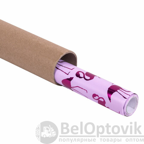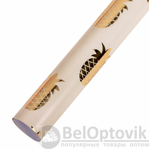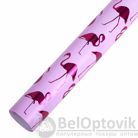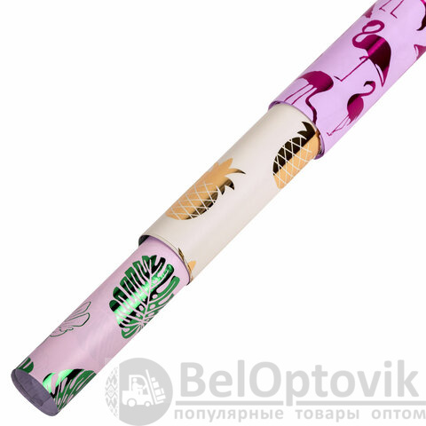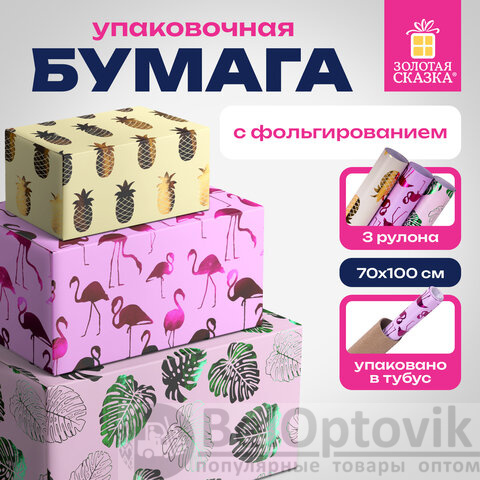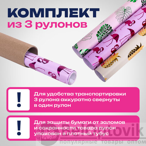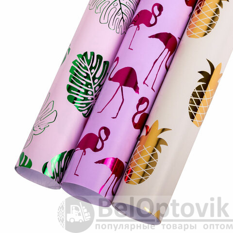 Набор из 3-х рулонов, каждый рулон – размером 70х100 см. Каждый из рулонов выполнен в оригинальном трендовом дизайне с ярким эффектом. Представляют собой мелованную бумагу с нанесенной на нее методом "хот стэмпинга" (горячего тиснения) фольгой с паттернами в виде фламинго, листьев, ананасов. Итоговая плотность бумаги - 82 г/м2.