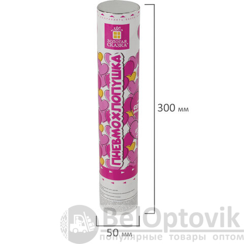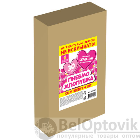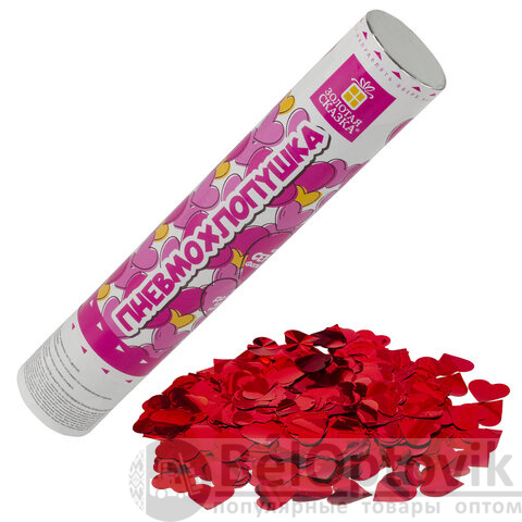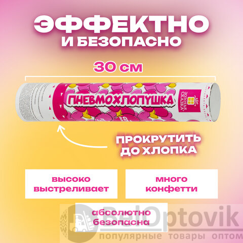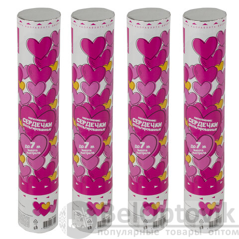 Комплект хлопушек высотой 30 см с фольгированным наполнителем в виде сердечек красного цвета является абсолютно безопасным. Выстрел осуществляется под действием сжатого воздуха. Не является пиротехникой. Средняя дальность выстрела – 5-7 м. Корпус хлопушки состоит из двух частей: пневматического баллона со сжатым воздухом и картонного цилиндра с наполнителем. Рекомендуется использовать хлопушку внутри больших помещений или на улице.