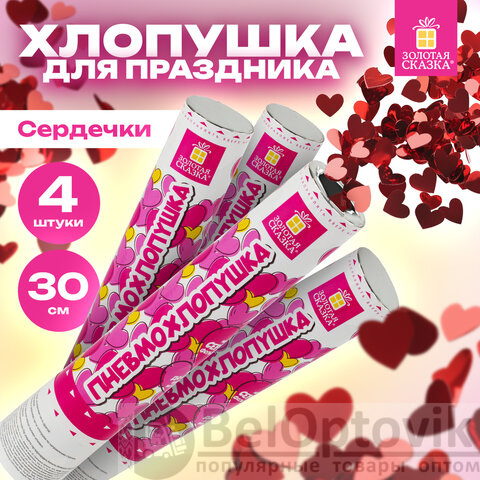 Хлопушка пневматическая 30 см "Сердечки", 3+1 шт. В ПОДАРОК, фольга цвет красный, ЗОЛОТАЯ СКАЗКА, 592082