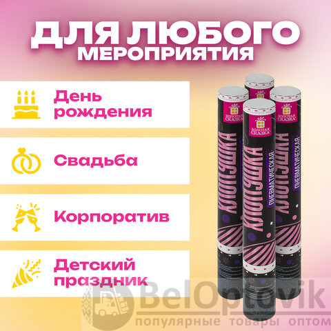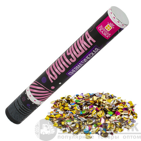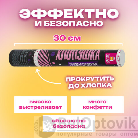 Пневматическая хлопушка не является пиротехникой и работает на основе энергии сжатого воздуха. Конфетти и серпантин ярких цветов можно использовать в помещении или на улице. Хлопушка подойдет для праздников, концертов, реквизита для фотосессии.