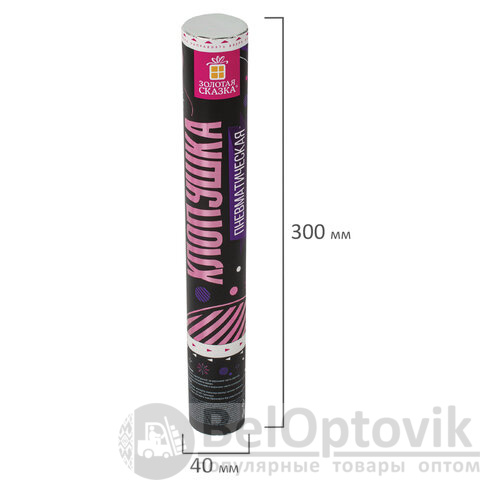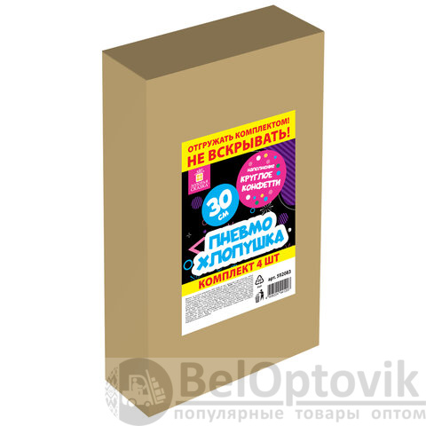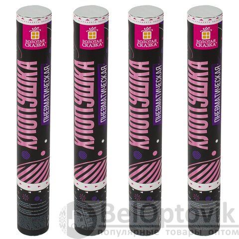 Комплект хлопушек высотой 30 см с фольгированным круглым наполнителем цвета ассорти является абсолютно безопасным. Выстрел осуществляется под действием сжатого воздуха. Не является пиротехникой. Средняя дальность выстрела – 5-7 м. Корпус хлопушки состоит из двух частей: пневматического баллона со сжатым воздухом и картонного цилиндра с наполнителем. Рекомендуется использовать хлопушку внутри больших помещений или на улице.