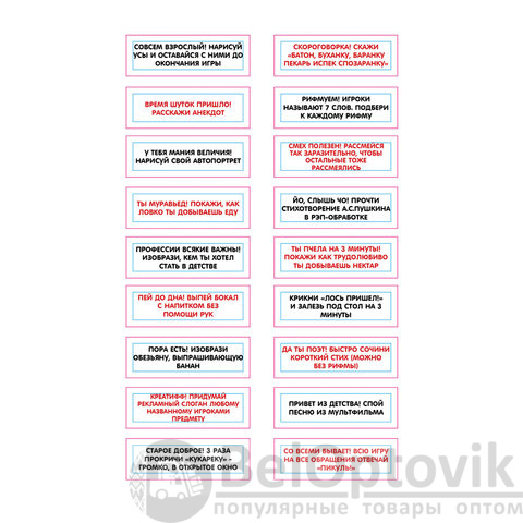 Задания (фанты) нанесены на бруски специальной краской, никакие пленки наклеивать не нужно, можно сразу играть. Краска безопасна, долговечна и является износостойкой. Брусочки ничем не покрыты, изготовлены из массива сухой вятской березы. Наличие надписи никак не отражается на игровых свойствах, все бруски скользят одинаково.