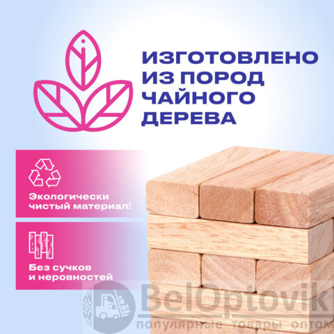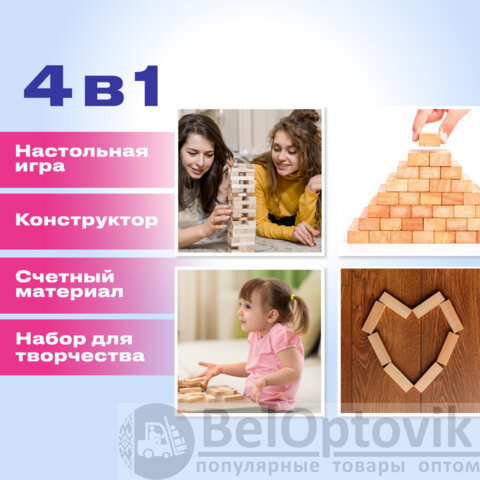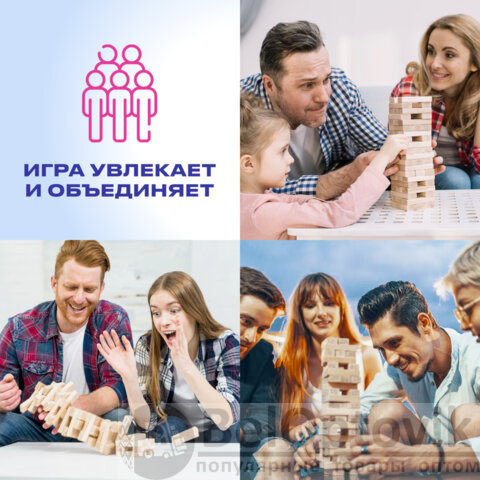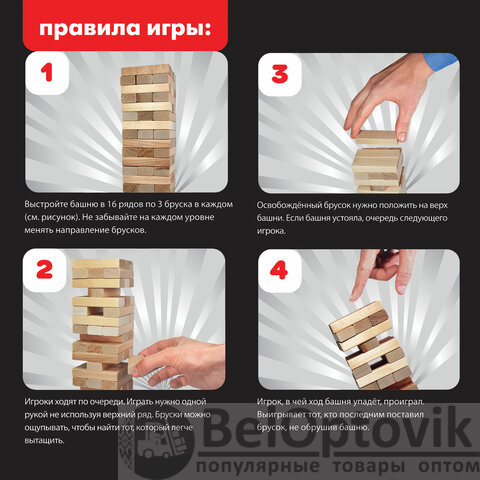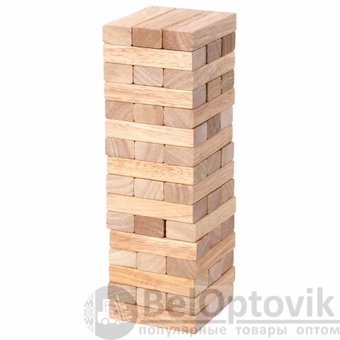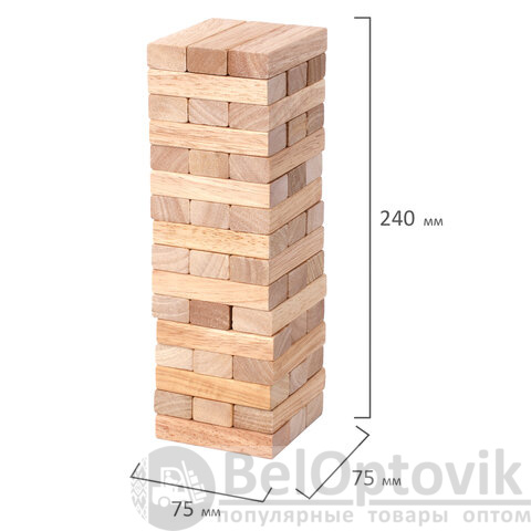 Настольная игра включает в себя 48 деревянных неокрашенных брусков размером 75х25х15 мм. Бруски гладкие и ровные, со скруглёнными углами.