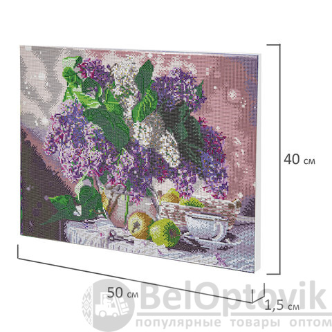 Размер готовой картины составляет 40х50 см. Картина полностью заполняется квадратными акриловыми стразами, благодаря чему готовая работа блистает и переливается на свету.