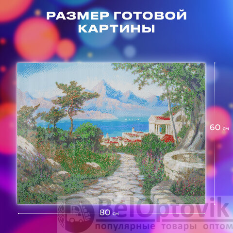 Размер готовой картины составляет 60х80 см. Картина полностью заполняется квадратными акриловыми стразами, благодаря чему готовая работа блистает и переливается на свету.