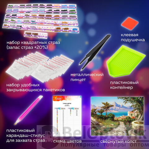 Техника алмазной мозаики проста в исполнении и не требует владения никакими специальными навыками. Все необходимые для работы материалы и инструменты входят в набор. С подробной инструкцией можно ознакомиться на упаковке.