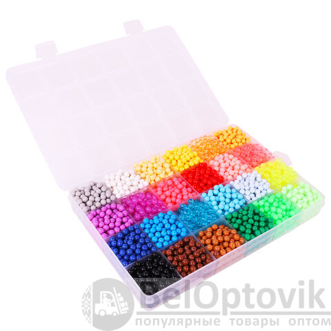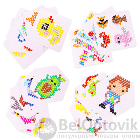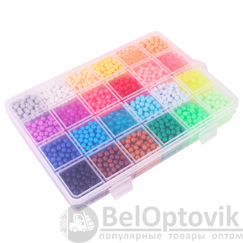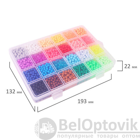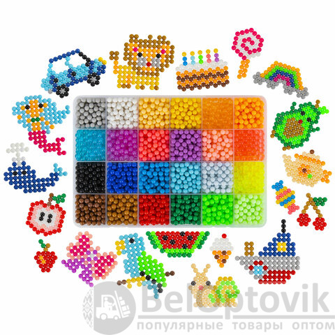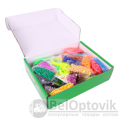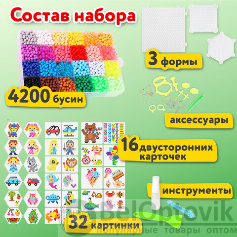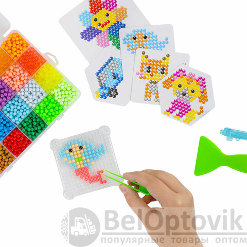 В набор входят бусины 24 различных цветов, около 175 штук каждого цвета, пластиковый контейнер с отсеками для удобного хранения бусин, 3 подставки-трафарета, 16 двусторонних карточек с картинками, бутылочка-пульверизатор для воды, специальная ручка для аквамозаики, лопатка для снятия готовой фигурки с трафарета, а также основы для браслета и других украшений, колечки и крепления для создания брелков, подвесок и других игрушек из бусин. Диаметр одной бусины – 0,5 см.