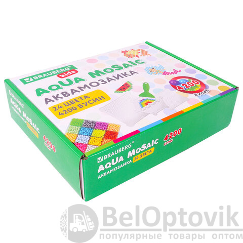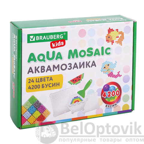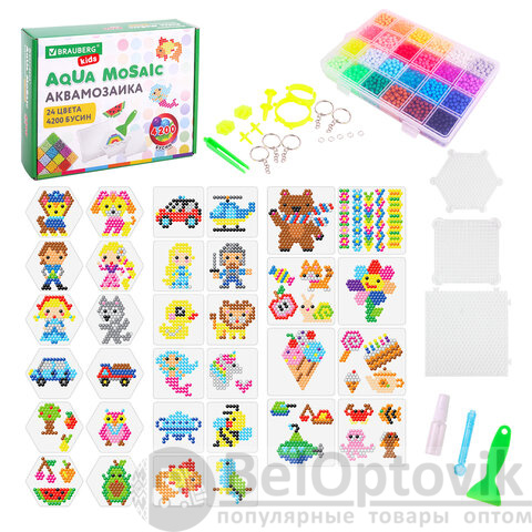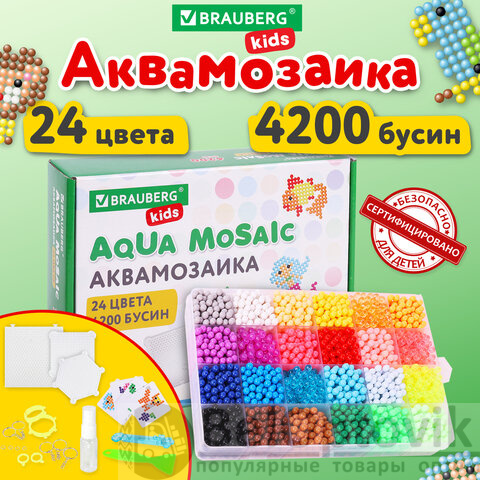 Аквамозаика 24 цвета 4200 бусин, с трафаретами, инструментами и аксессуарами, BRAUBERG KIDS, 664916