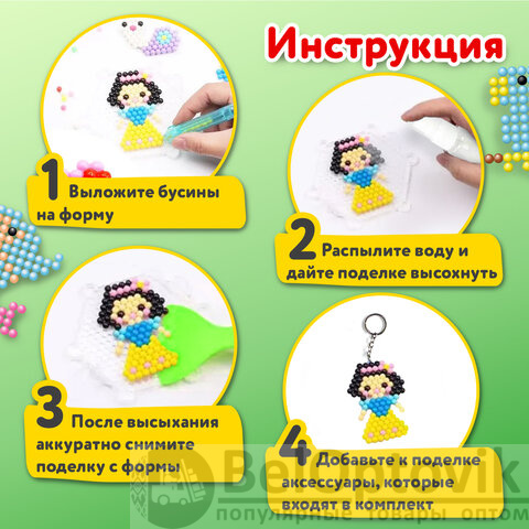 - Комплектация: бусины, бутылочка-пульверизатор, карточки, лопатка, пластиковые элементы, подложка