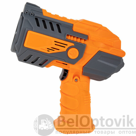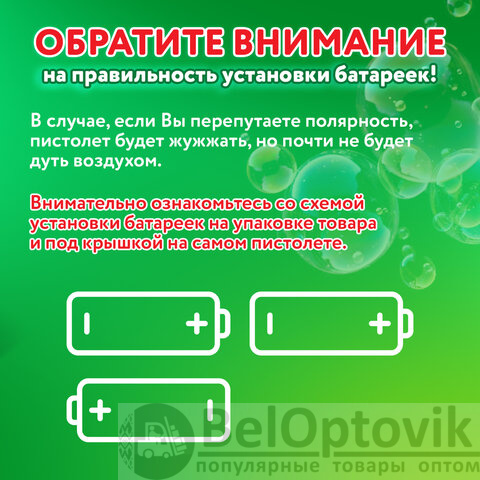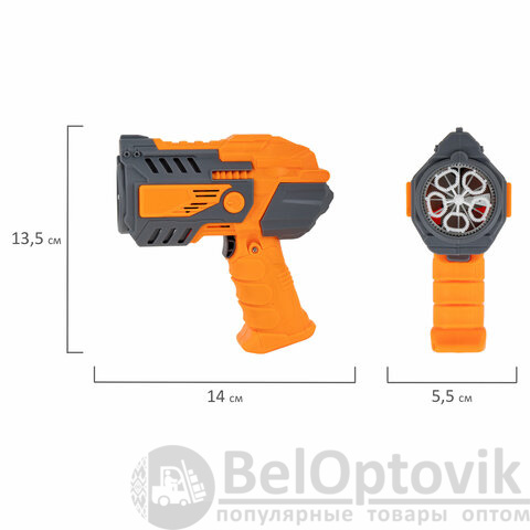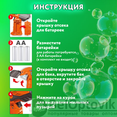 Бластер – генератор для выдувания мыльных пузырей с подсветкой. Работает от батареек. Прилагается 2 декоративных пластиковых бака и мыльный раствор объемом 80 мл. Для работы потребуются 3 АА батарейки (в комплект не входят).