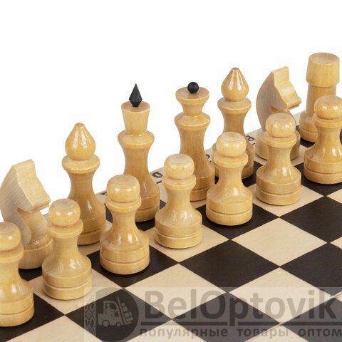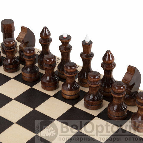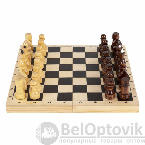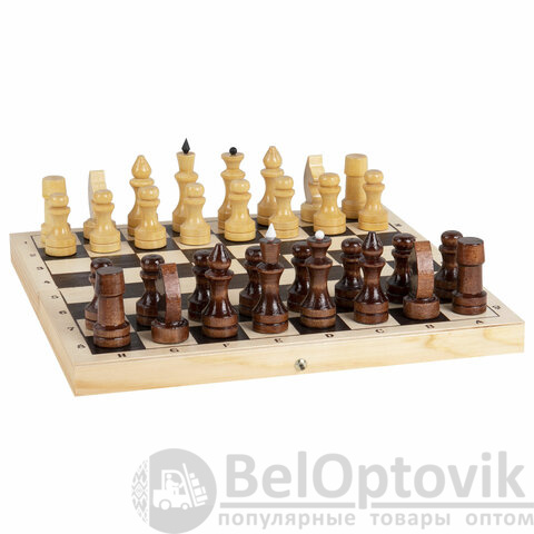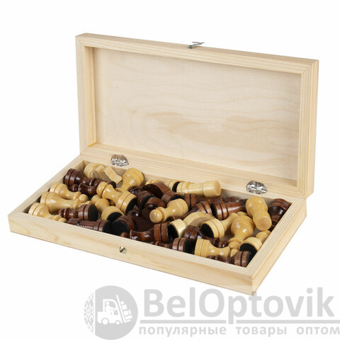- шахматные фигуры из хвойных и лиственных пород дерева (32 штуки), 16 светлых и 16 темных.