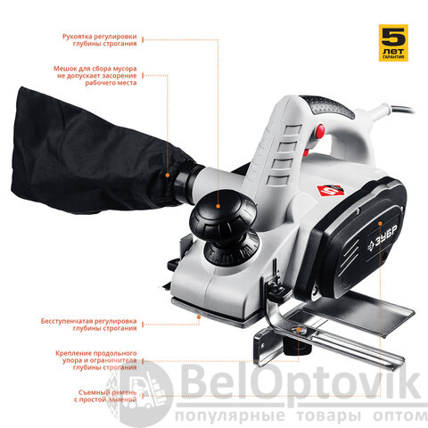 Мощный рубанок ЗУБРдля строгания шириной 82 мм и глубиной 3 мм, а также выравнивания поверхностей и снятия фасок. Конструкция обеспечивает возможность выборки четверти. Бесступенчатая регулировка глубины строгания с точностью 0,1 мм.