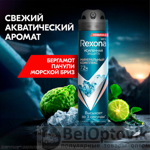 Сразу после освежающего душа воспользуйтесь новинкой сухим спреем-антиперспирантом REXONA "Минеральный комплекс". Улучшенная формула высыхает за 3 секунды и оставляет приятное ощущение на коже. Без липкости, без следов. Антиперспирант разработан на основе формулы усиленной эффективности: создает дышащий микробарьер для непревзойденной защиты от пота и запаха на 72 часа*. Технология Motionsense активируется при движении, сохраняя свежесть на весь день. Свежий цитрусовый аромат с акватическими нотами садится близко к телу и не перебивает аромат вашего парфюма.
