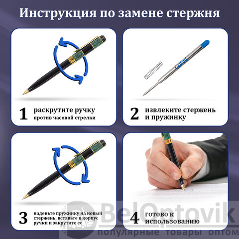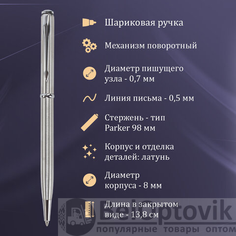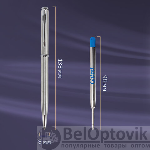 Ручка: синий цвет чернил, длина стержня составляет 98 мм, а диаметр пишущего узла - 0,7 мм. Поставляется в индивидуальном футляре. Корпус ручки подходит для гравировки.