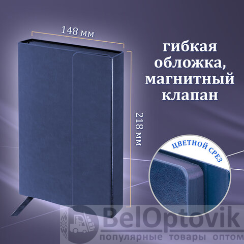 Ежедневник: внутренний блок включает 160 листов тонированной бумаги плотностью 70 г/м2. Каждая страничка имеет перфорированный угол. Благодаря стандартному формату А5 ежедневник удобно использовать как в офисе, так и на выездных деловых встречах. Интегральная обложка, стилизованная под гладкую кожу, фиксируется магнитным клапаном, поэтому ежедневник не откроется в сумке или портфеле и страницы не помнутся. Подходит для горячего тиснения. Срез и форзац ежедневника окрашены в цвет обложки, что придает ему особый шарм. Дополнением является закладка-ляссе, с помощью которой при необходимости можно быстро открыть ежедневник на нужной странице.