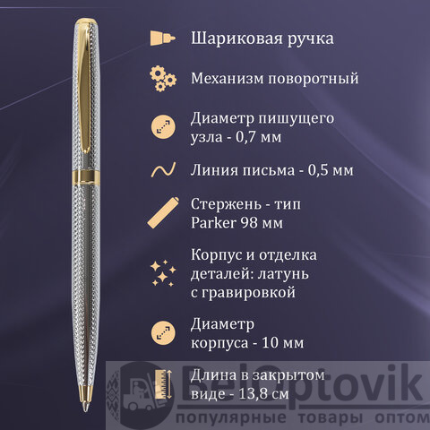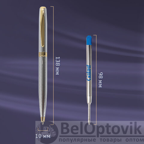 Ручка: синий цвет чернил, длина стержня составляет 98 мм, а диаметр пишущего узла - 0,7 мм. Поставляется в индивидуальном футляре. Корпус ручки подходит для гравировки.