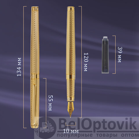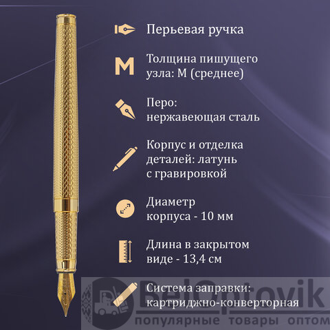 Ручка: Синий цвет чернил; иридиевое перо украшено гравировкой. Диаметр пишущего узла - 0,8 мм. Тип пера M (Medium) - средняя ширина линии. Поставляется в индивидуальном подарочном футляре. Подходит для гравировки. Картридж находится внутри корпуса.