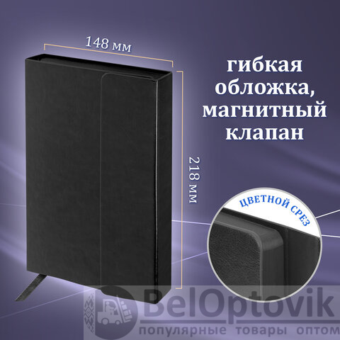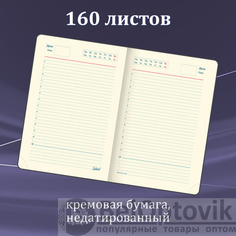 Ежедневник: Внутренний блок включает 160 листов тонированной бумаги плотностью 70 г/м2. Каждая страничка имеет перфорированный угол. Благодаря стандартному формату А5 ежедневник удобно использовать как в офисе, так и на выездных деловых встречах. Интегральная обложка, стилизованная под гладкую кожу, фиксируется магнитным клапаном, поэтому ежедневник не откроется в сумке или портфеле и страницы не помнутся. Подходит для горячего тиснения. Срез и форзац ежедневника окрашены в цвет обложки, что придает ему особый шарм. Дополнением является закладка-ляссе, с помощью которой при необходимости можно быстро открыть ежедневник на нужной странице.