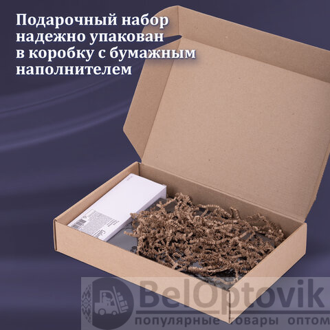 Набор состоит из перьевой ручки с корпусом из латуни золотистого цвета и недатированного ежедневника черного цвета с магнитным клапаном. В комплекте с набором поставляется брендированный подарочный пакет, который сделает подарок завершенным.