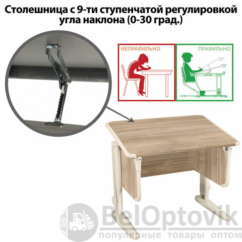 Столешница легко регулируется по наклону от 0° до 30°, подбирается оптимальное положение для любых занятий.