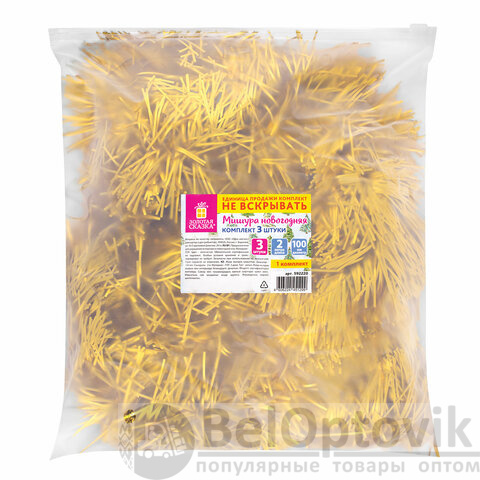 Длина мишуры в расправленном виде составляет 2 м, диаметр – 10 см. Материал мишуры – полиэтилентерефталат. В комплекте – 3 штуки мишуры золотистого цвета. Упакованы в пакет с зиплоком.