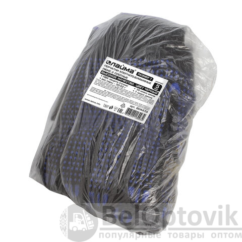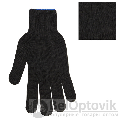Изготовлены из хлопчатобумажной пряжи плотностью 133 текс с покрытием из поливинилхлорида с нанесением рисунка на внутреннюю сторону перчатки. Покрытие ПВХ помогает обеспечить плотный захват и предотвращает соскальзывание детали. Резинки на манжетах обеспечивают плотное прилегание перчатки к руке. Перчатки черного цвета имеют 10 класс вязки. Вес пары - 50-52 г. Поставляются в комплекте 5 штук в полиэтиленовой упаковке.