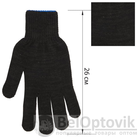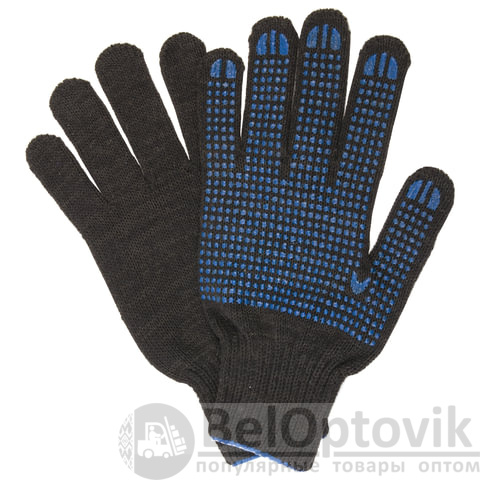 Изготовлены из хлопчатобумажной пряжи плотностью 216 текс с покрытием из поливинилхлорида с нанесением рисунка на внутреннюю сторону перчатки. Покрытие ПВХ помогает обеспечить плотный захват и предотвращает соскальзывание детали. Резинки на манжетах обеспечивают плотное прилегание перчатки к руке. Перчатки черного цвета имеют 7 класс вязки. Вес пары - 65-67 г. Поставляются в комплекте 5 штук в полиэтиленовой упаковке.