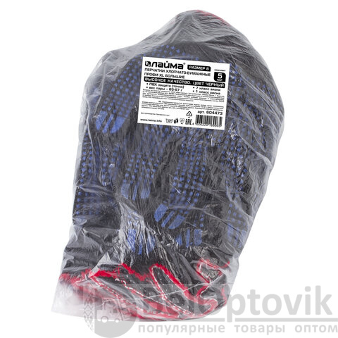 Перчатки хлопчатобумажные, КОМПЛЕКТ 5 ПАР, 7 класс, 65-67 г, 216 текс, ПВХ-точка, LAIMA "ПРОФИ" XL, черные, 604473