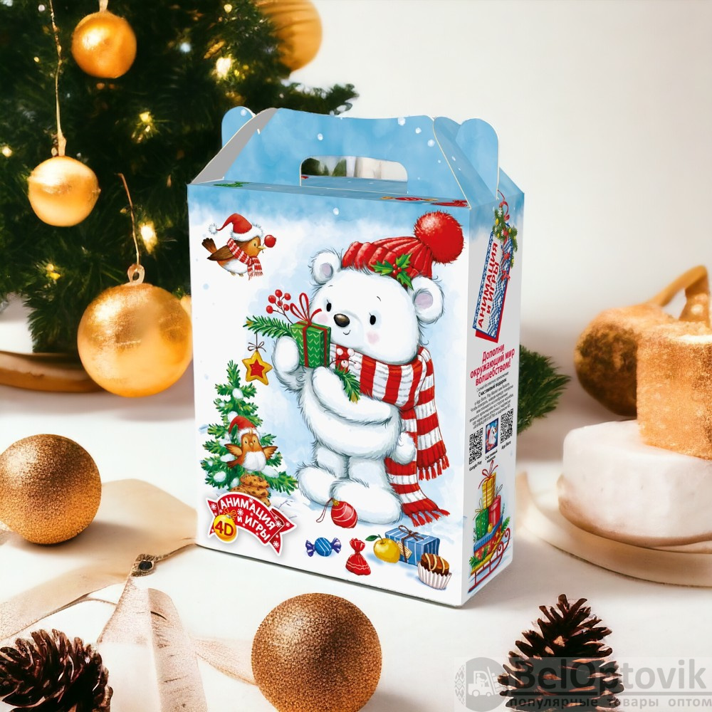 Это делает её идеальным украшением для новогодней ёлки или любого другого уголка вашего дома. Яркий дизайн и анимационные элементы создают атмосферу уюта и волшебства, что делает упаковку идеальной для хранения новогодних подарков или сладостей.