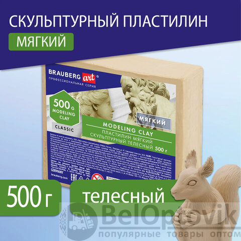 Пластилин скульптурный BRAUBERG ART CLASSIC, телесный, 0,5 кг, мягкий, 106515