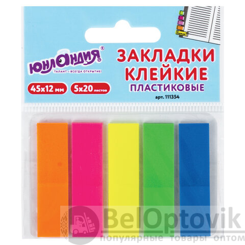 Закладки клейкие неоновые ЮНЛАНДИЯ, 45х12 мм, 100 штук (5 цветов х 20 листов), на пластиковом основании, 111354