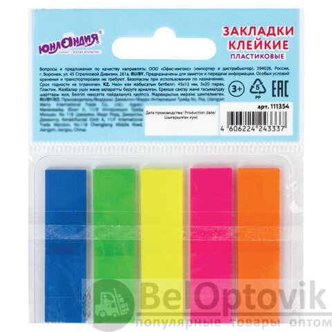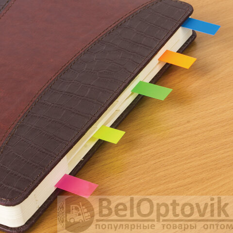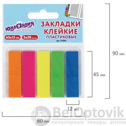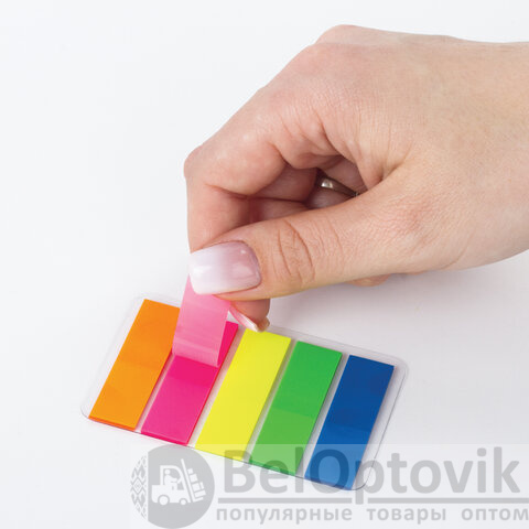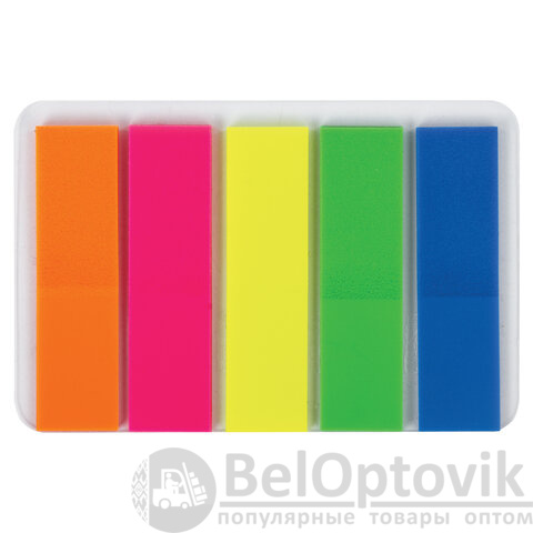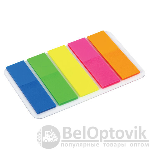 В наборе по 20 закладок каждого из 5 цветов. Размер закладки: 45х12 мм. Клейкий слой - 22 Н/м. Материал закладок позволяет делать на них надписи ручкой или карандашом. Поставляются в полиэтиленовом пакете с европодвесом.