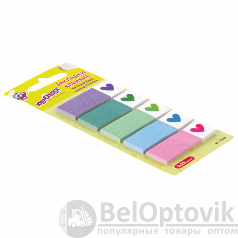 В наборе по 25 закладок каждого из 5 цветов. Размер закладки: 45х15 мм. Клейкий слой - 32 Н/м. Материал закладок позволяет делать на них надписи ручкой или карандашом. Поставляются в полиэтиленовом пакете с европодвесом.