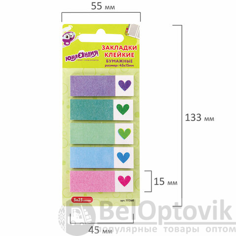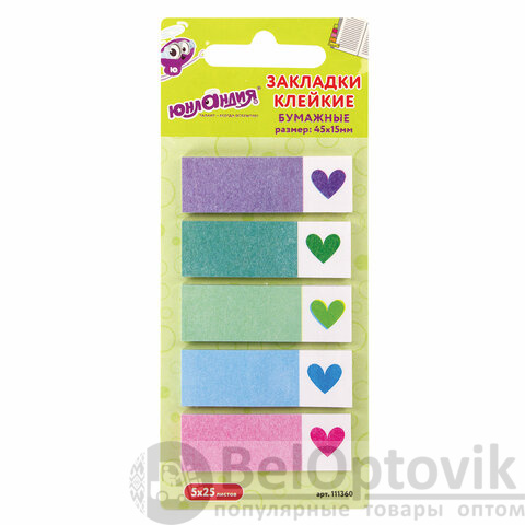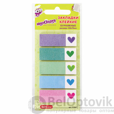 Закладки клейкие ЮНЛАНДИЯ бумажные "Сердечки", 45х15 мм, 125 штук (5 цветов х 25 листов), 111360