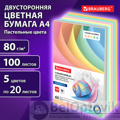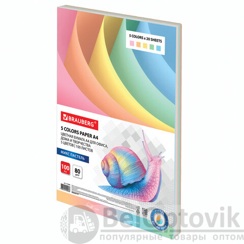 Бумага цветная BRAUBERG, А4, 80 г/м2, 100 л., (5 цветов х 20 листов), пастель, для офисной техники, 112460
