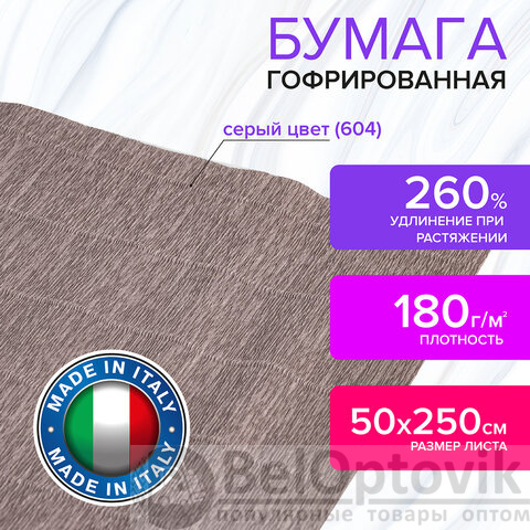 Бумага гофрированная/креповая (ИТАЛИЯ) 180 г/м2, 50х250 см, серая (604), BRAUBERG FIORE, 112655