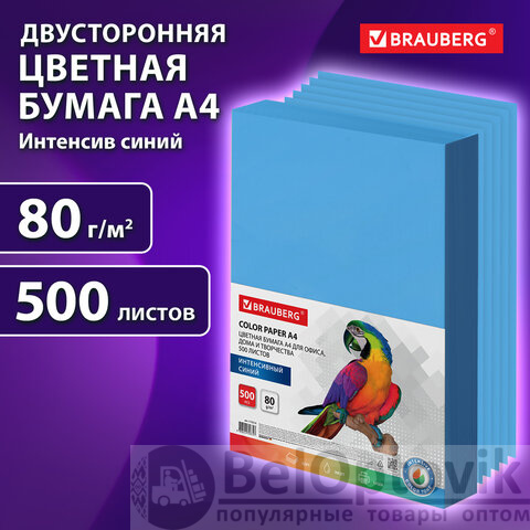 Бумага цветная BRAUBERG, А4, 80 г/м2, 500 л., интенсив, синяя, для офисной техники, 115214