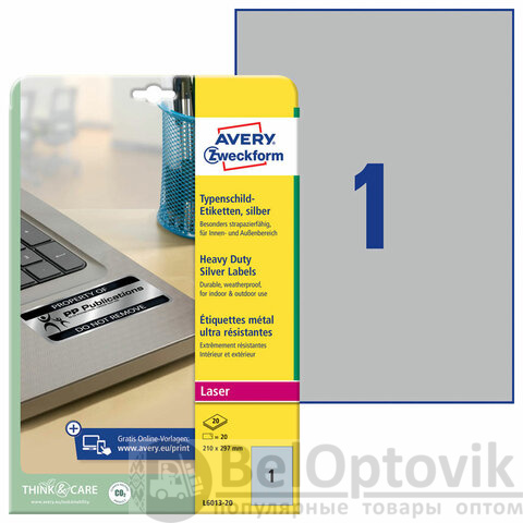 Этикетка самоклеящаяся 210x297 мм, 1 этикетка, полиэстер, серебро, 20 листов, Avery Zweckform, L6013-20