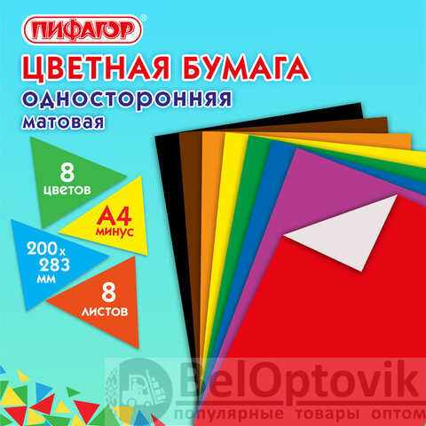 Цветная бумага ПИФАГОР, состоящая из ярких и насыщенных цветов, позволит создать прекрасную аппликацию или поделку. Цвета: чёрный, фиолетовый, синий, красный, зелёный, голубой, коричневый, жёлтый.